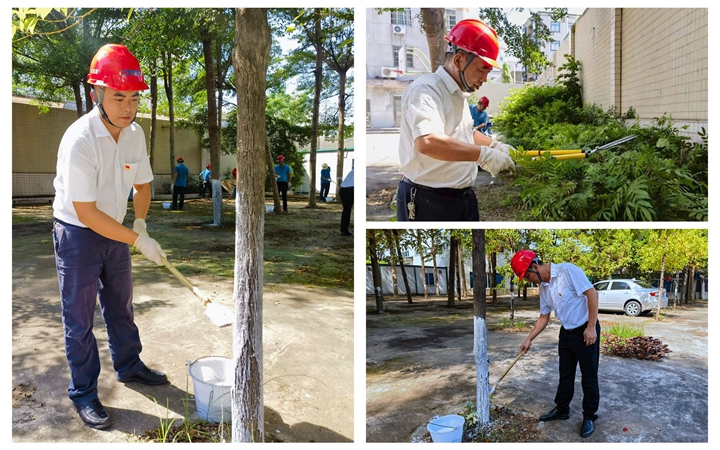活動當(dāng)日,黨員干部們分工明確,快速投入到辦公園區(qū)環(huán)境衛(wèi)生治理,對園區(qū)樹木進行蟲害消殺,穿上“石灰白大褂”。他們不怕臟、不怕累,一起撿拾垃圾、清掃雜物,對主干道、籃球場等地的雜草雜物進行徹底清理,有條不紊地對綠化帶進行剪綴,切實消除了園區(qū)的“視覺污染”,提升了辦公園區(qū)環(huán)境衛(wèi)生質(zhì)量。