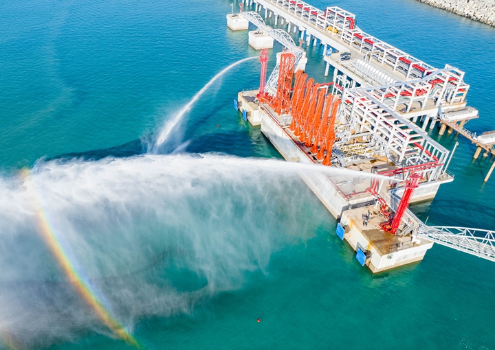 2023年12月7日下午,隨著公用工作樓首層消防泵房的紅色“巨獸”傳出一聲噪響,矗立10萬噸級成品油泊位兩側(cè)靠船平臺上的消防炮塔噴射出兩道水柱,標志著茂名港博賀新港區(qū)東區(qū)10萬噸級成品油碼頭項目大型消防泵組和消防炮塔聯(lián)合運行成功,為項目即將轉(zhuǎn)入運營提供消防安全保障。